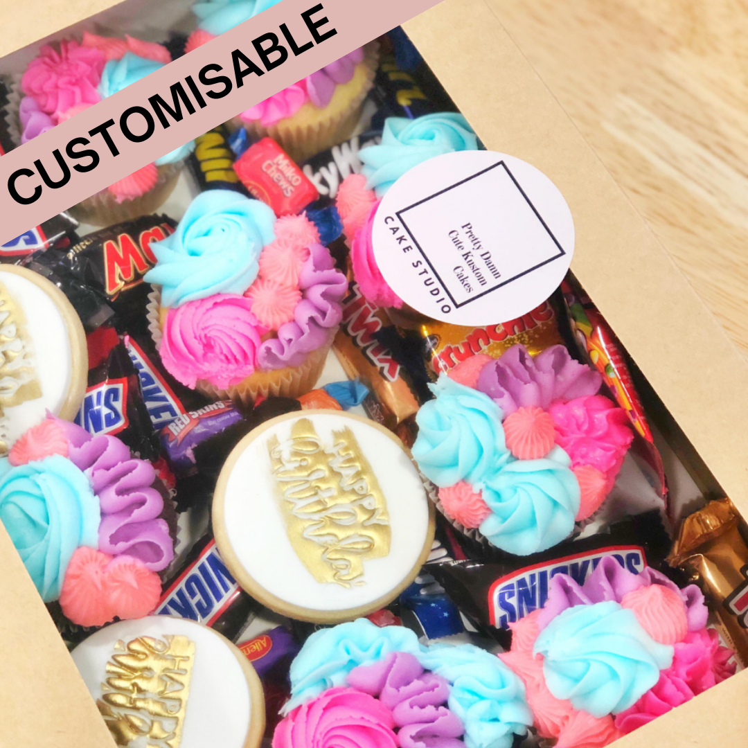 There's nothing like a box of delicious treats, so why not give this dessert box as your next gift? This dessert box includes 9 vanilla cupcakes, 3 fondant cookies, and approximately 24 mini chocolates / lollies.